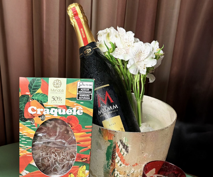 Chocolate Mendoá “tree to bar”, prata no Chocolate Awards 2025, 50% cacau com castanha de caju e banana. Uma produção sustentável que harmoniza perfeitamente com o frescor do espumante Mumm.