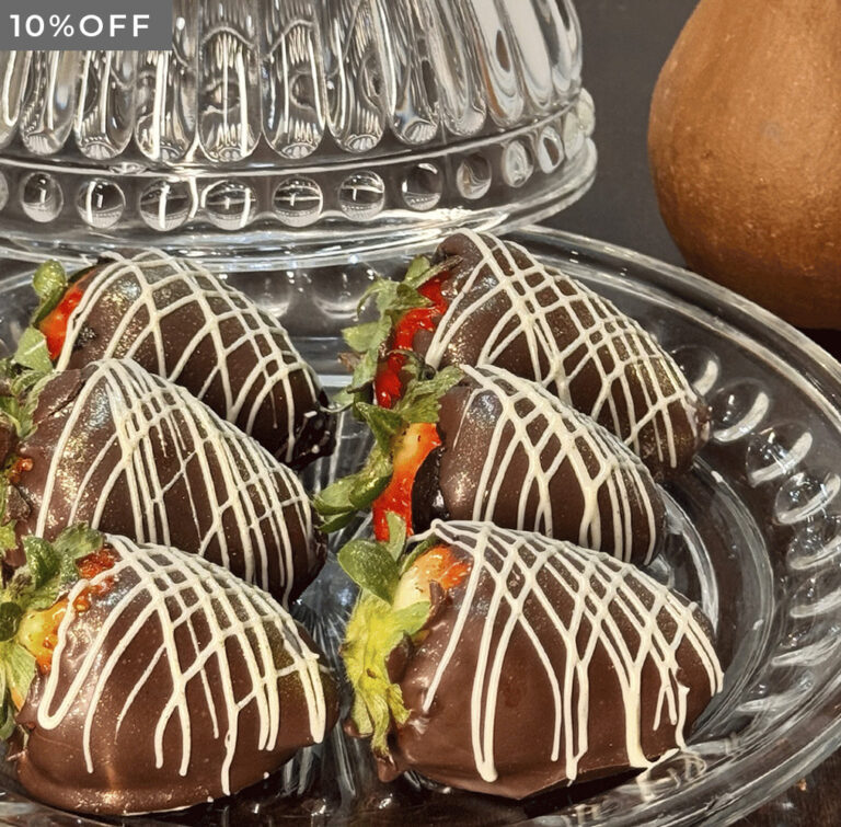 Morangos envoltos em chocolate e brigadeiro, preparados com elegância para receber você com sabor e encanto (370g).